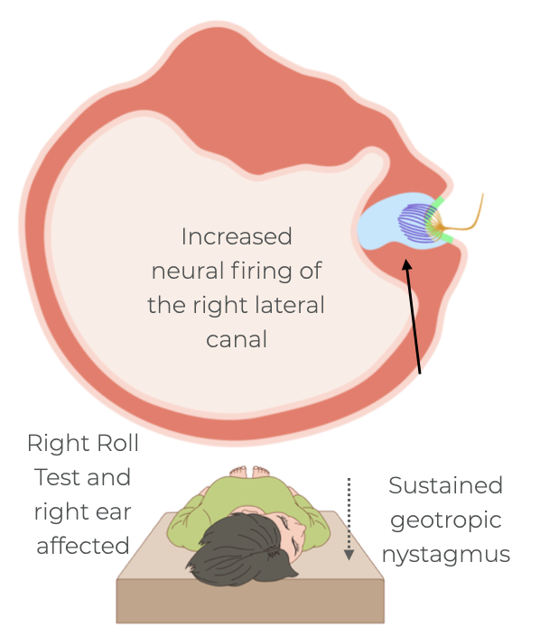 At first glance, sustained geotropic nystagmus during bilateral roll testing can resemble lateral canal BPPV or, less commonly, cupulolithiasis (heavy cupula). Several features argued against classic canalithiasis: