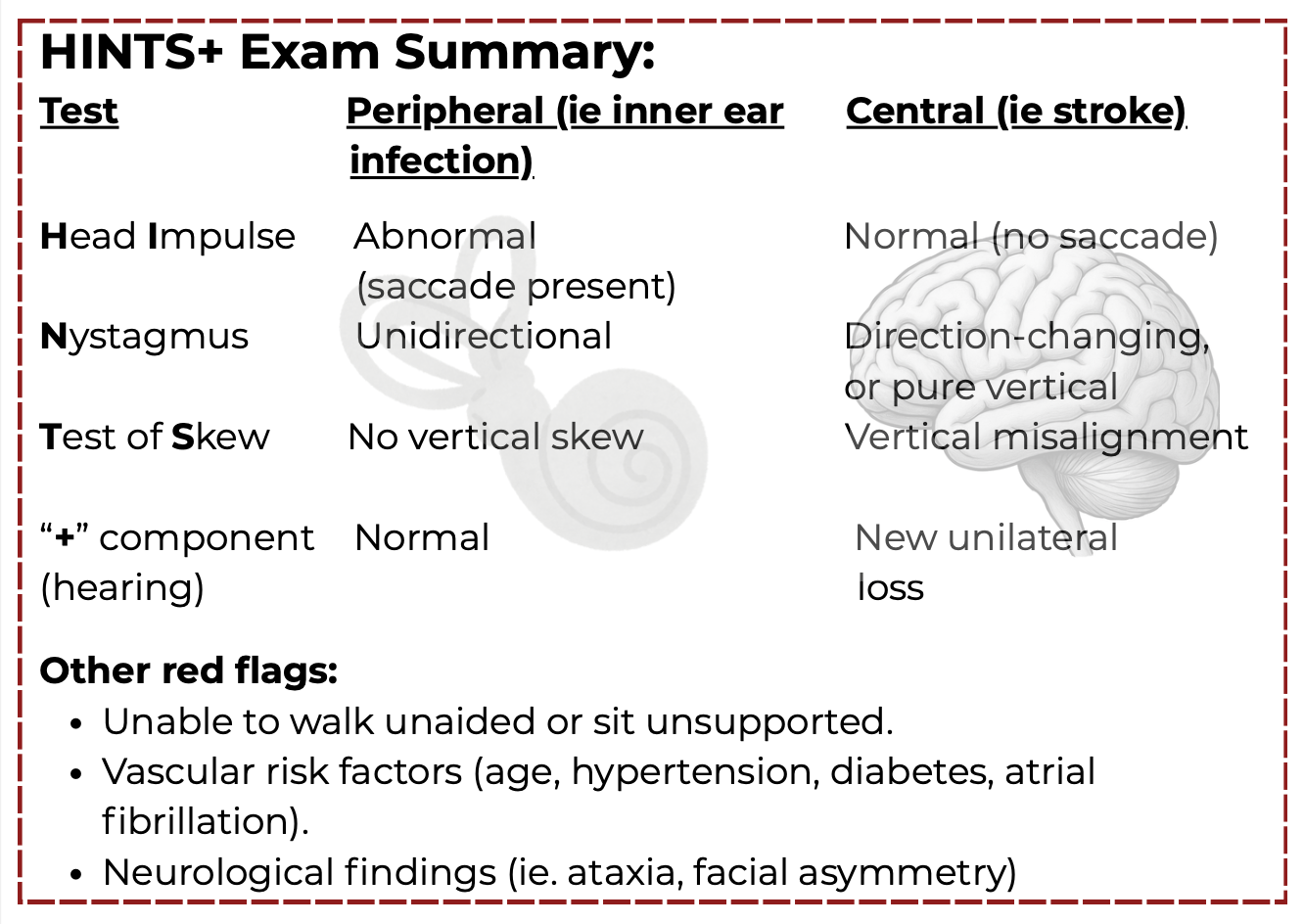 - With acute vestibular syndrome (AVS), if hearing loss is present, even with peripheral signs, order a MRI to rule out stroke